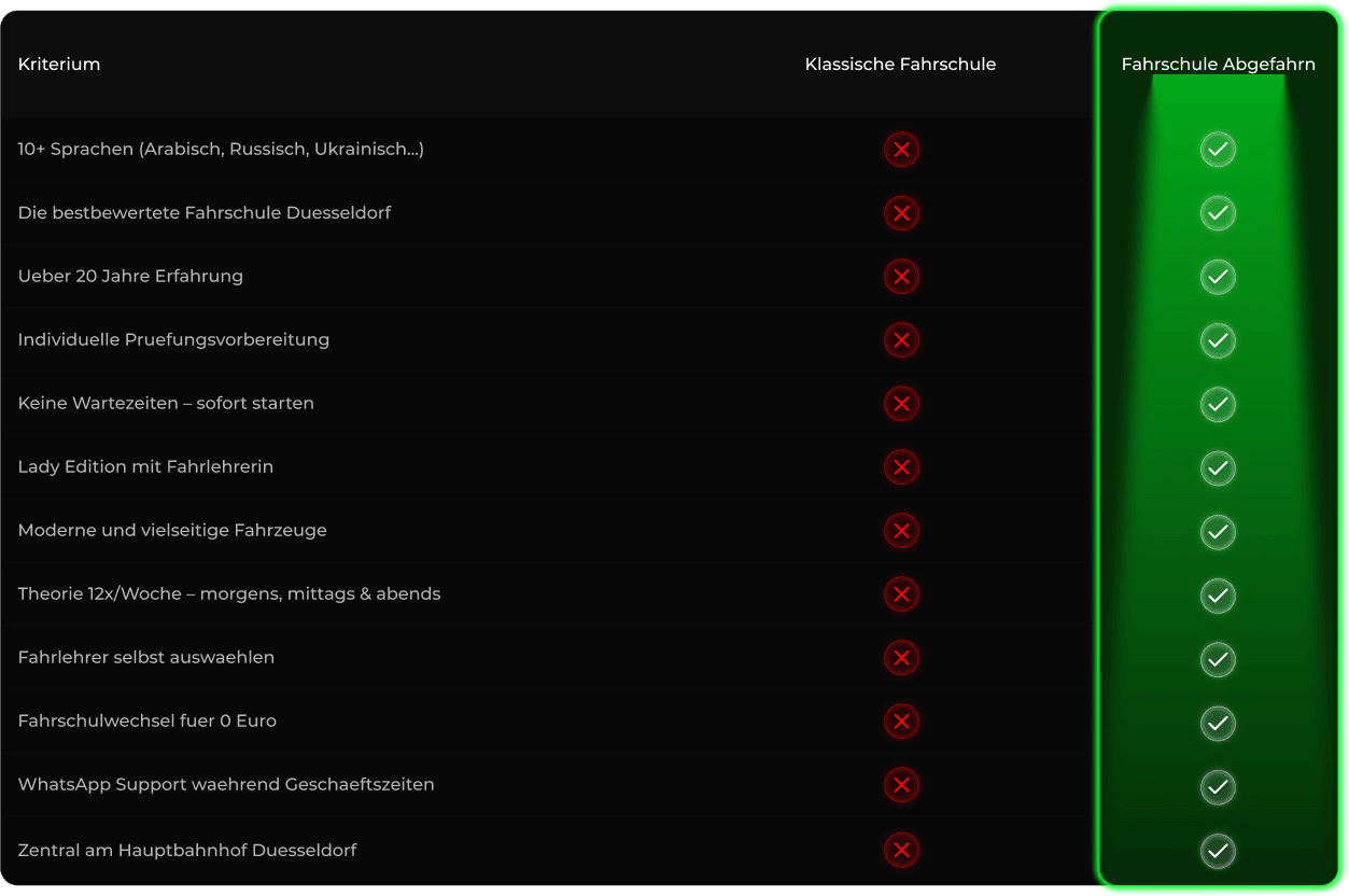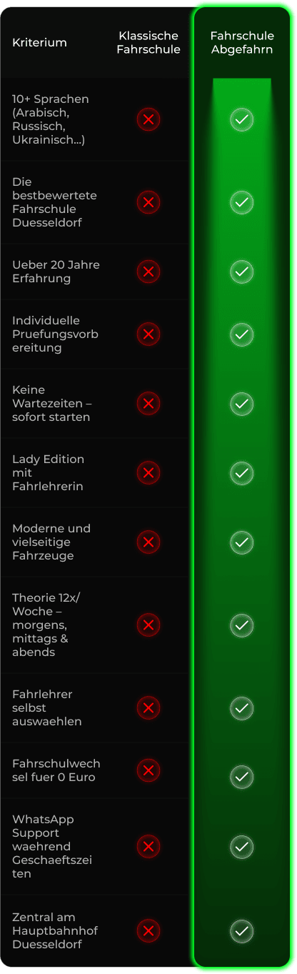 Die erstklassige Fahrakademie für den Führerschein. Wir bieten eine breite Palette von Führerscheinklassen an und sind in der Nähe und zentral neben dem Hauptbahnhof Düsseldorf gelegen. Wir bieten einige Klassen an und speziell auch den Frauen Führerschein und Auffrischungskurs. Wir sind dein persönlicher Ansprechpartner für deine Führerschein Ausbildung und bieten dir alle Informationen in einem Erstgespräch gratis an! Hast du noch Bock auf Bus und Bahn angewiesen zu sein? Verlier deinen gewünschten Führerschein nicht aus dem Blick! Jede Person wird bei uns individuell betreut! Wir bieten die Führerscheinausbildung in mehreren Sprachen an – damit jeder sicher, verständlich und erfolgreich lernen kann. Wir unterrichten in: Deutsch, Englisch, Ukrainisch, Arabisch, Russisch, Tschechisch, Syrisch, Berberisch (Thmazight), Ägyptisch und Farsi.